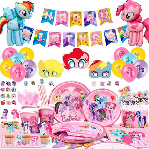 164pcs My Little Pony Birthday Decorations&Tableware Set – My Little Pony Party Plates and Napkins Banner Balloons etc LittlePony Theme Party Supplies DescriptionMy Little Pony Party Supplies Set: The pony party decorations include 1 my little pony banner,13 my little pony cake toppers,12 my little pony balloons,40 my little pony stickers,1 my little pony tablecloth,10 7″ my little pony plates,10 9″ my little pony dinner plates,10 little pony paper napkin,3 my little pony mask etc my little pony birthday party supplies.