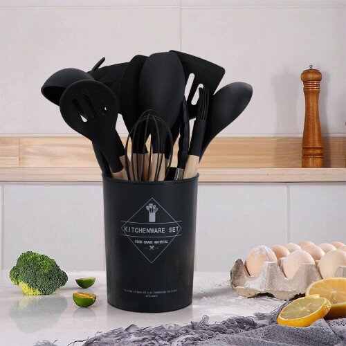 (Black) 11-piece Silicone Kitchen Utensil Set for Nonstick Cookware Non-stick Spatula Bakeware Accessories DescriptionThis silicone cooking utensil set will be your irreplaceable assistant in the kitchen. This set has 11 pieces in total and caters to almost every need in the kitchen. Made from high-quality food-grade silicone, these utensils are durable and heat-resistant up to 446°F (230°C). The soft silicone will not scratch or damage your non-stick pots and pans. And thanks to the material, the utensils are easy to clean as well. Comes in a unified colour, this set will make your kitchen more elegant.