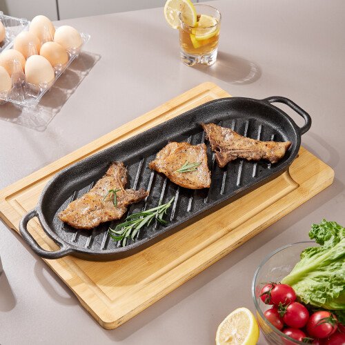 SummaryHeavy-duty cast iron for lasting heat and even cooking.Double flat handles for easy maneuvering on stove or grill.Ridged surface creates restaurant-style grill marks.Drains excess oil for healthier meals and cleaner pans.Large oval 43cm pan for family-sized grilling sessions.Black Oval Cast Iron Grill Pan with Handles Even-Heat Grilling, Ridged Surface for Perfect Grill Marks Description Picture a warm evening with friends and laughter as you sear perfect steaks on the Black Oval Cast Iron Grill Pan with Handles. Crafted from heavy-duty cast iron, this pan is built to last a lifetime, with heat retention that stays steady for consistent, restaurant-quality searing every time. Its signature ridged surface drains away excess oil, delivering deeper flavor and healthier grilled dishes without compromising on taste. Ideal for those who want a balanced lifestyle, indoor cooking or outdoor grilling alike.