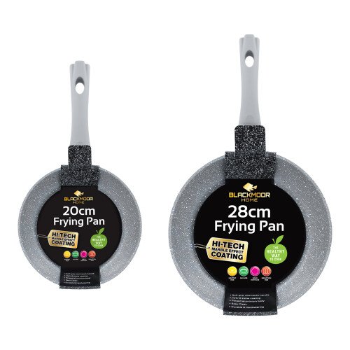 Summary2PC FRYING PAN SET This 2-piece frying pan set is a kitchen must-have. Coming in two handy sizes, 20cm and 28cm, these durable, flat-bottomed pans can be used for frying, searing and browning just about anything including vegetables, meat and fish.SUITABILITY – Like all Blackmoor pans, they are suitable for cooking on electric hobs, gas hobs, induction hobs and hot plates. The stylish, grey marble effect coating will complement any kitchen and is also scratch resistant, so your pans stay looking like new for longer.COOL-TOUCH HANDLES – The pans have bakelite handles that stay cool to the touch to ensure your comfort and safety while you are whipping up culinary delights. The handles also have convenient holes for hanging or for holding utensils during cooking.NON-STICK COATING The pans’ non-stick coating means they are easy to clean, require less oil and ensure better food release. The hybrid stone coating allows heat to conduct faster which the pans retain during the cooking process.BLACKMOOR HOME: Blackmoor Home are the expert manufacturers of the very best kitchen appliances. From frying pans and cooking pots, to kitchen utensils and chopping boards, you can get everything you need for the kitchen at the Benross Group OnBuy store page today!Blackmoor 67219 2 Piece Frying Pan Set / 20cm & 28cm / Non-Stick / Grey Description2-Piece Frying Pan Set | Non-Stick Pans | 20cm & 28cm Diameter | Cool Touch Handles