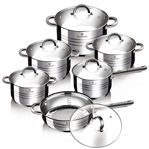 SummaryBrand: Blaumann; Made Of Stainless Steel – 5 Layer BottomDishwasher Safe – Easy To CleanSuits All Stoves Including InductionSet Includes: 4 Stock Pots With 4 Lids, 1 Saucepan With Lid, 1 Frying Pan With LidStock Pots: 14.5×24 – 6.5L, 12.5×20 – 3.9L, 11.5×18 – 2.9L, 10.5×16 – 2.1L; Saucepan: 10.5×16 – 2.1L; Frying Pans: 7.5×24 – 2.1LBlaumann 12Pc Cookware Set Stainless Steel Non Stick Pots Induction DescriptionWith an eye catching design this set is a striking addition to any kitchen.