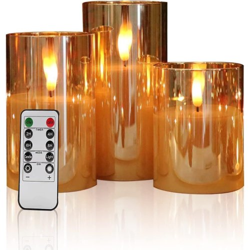 (Gold) 3 Pack Glass Candles Wax LED Set With Remote Control Timer Flameless Flickering DescriptionRealistic Glass Flameless Candles – These gray glass led candles has real flame effect, real wax in glass holder, flickering softly and giving off a warm white glow, creating a cozy feelingRemote Control & Timer Function – You can control all candles with remote control(on/off, bright/dim, 4/8 hours timer function), remote range is 20ft(Max).Battery Operated Candles – Each led candle is powered by 2 x AA battery ( not included) with flickering effect(fixed flame), lasting over 350 hours, LED bulb has a 50,000+ hours lifeSAFE & No Mess – Lifelike look while unscented, no drips, no smoke, no hazard, our candles safely go where traditional flame candles can’t, perfect for your home with kids and pets.3 Pack Candles Gifts Set – Well box packaged, it comes with 3 pieces grey glass candles, 3 inch diameter, 4/5/6 inch tall, 1 user manual, 1 remote, these beautiful grey candles are great decorations for home, table, date and also ideal as holiday gifts, like Christmas